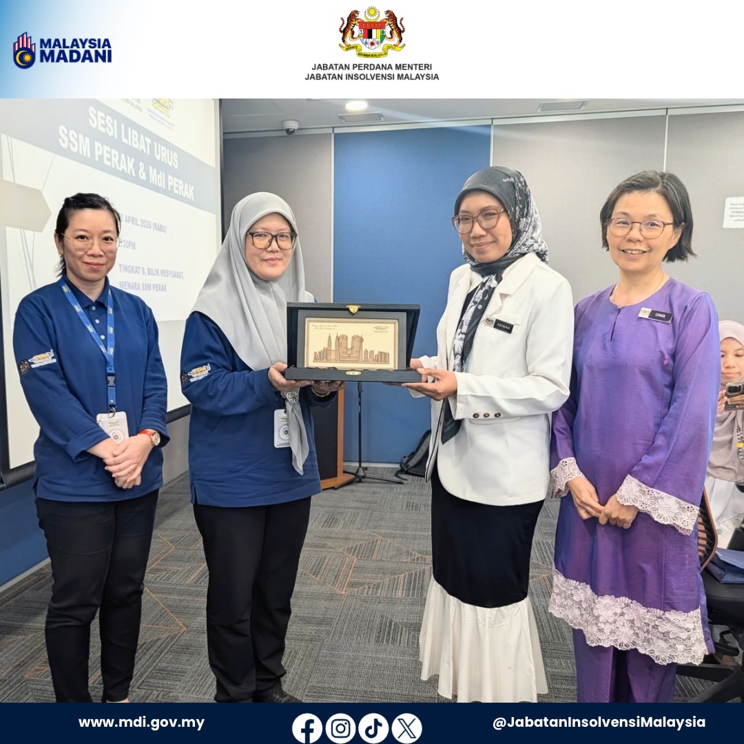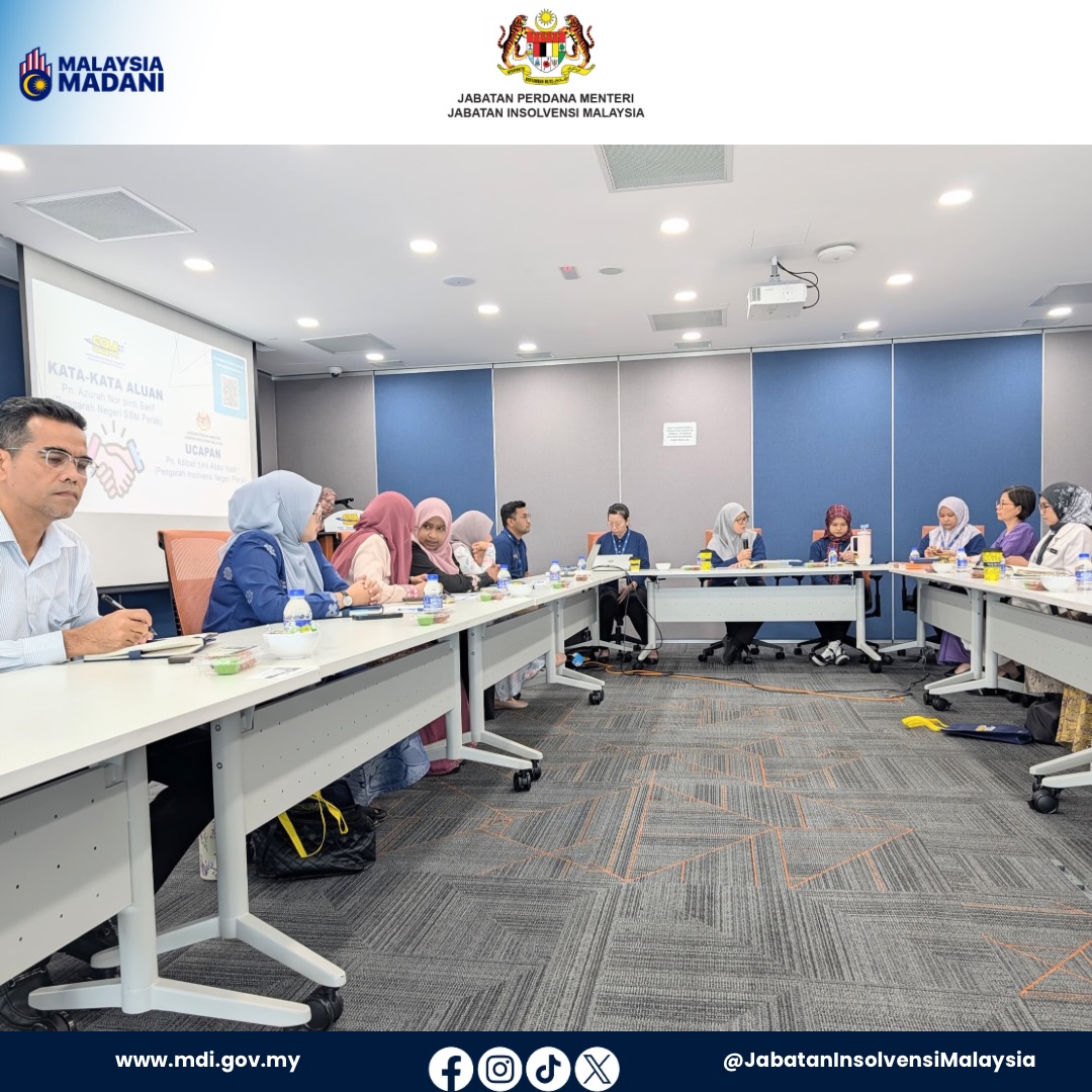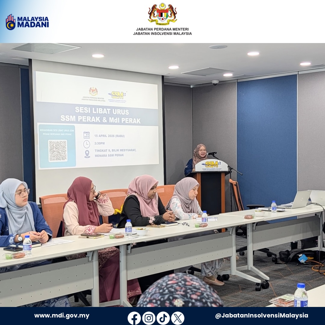 Jabatan Insolvensi Malaysia (MdI) Negeri Perak bersama MdI Cawangan Taiping telah menghadiri satu sesi libat urus bersama Suruhanjaya Syarikat Malaysia (SSM) Negeri Perak yang berlangsung pada 15 April 2026.