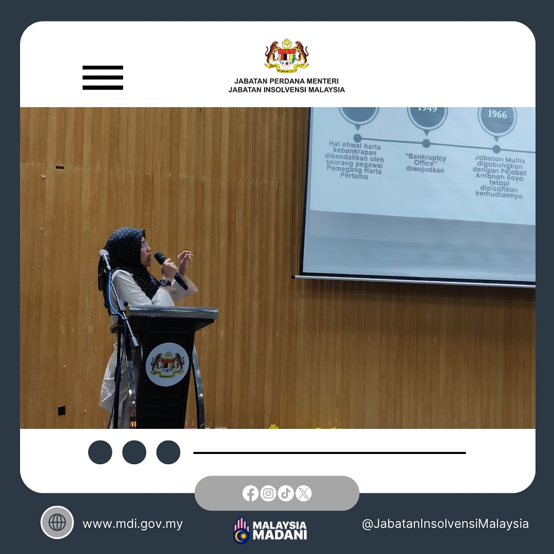 Ceramah telah disampaikan oleh Cik Awfa binti Abdul Gafar, Penolong Pengarah Insolvensi Negeri, Jabatan Insolvensi Cawangan Ipoh, Perak dengan bantuan daripada Puan Siti binti Mohd Tajuddin dan Puan Sarinawati binti Radzuan dari Unit Komunikasi Korporat.