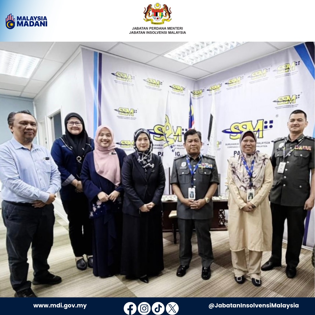 Sesi kunjungan ini bertujuan mengeratkan hubungan dua hala, di samping menjadi platform pertukaran pandangan serta perbincangan berhubung potensi kerjasama antara MdI dan SSM khususnya dalam aspek perkongsian maklumat, penyelarasan tugas serta pengurusan kes melibatkan entiti perniagaan.