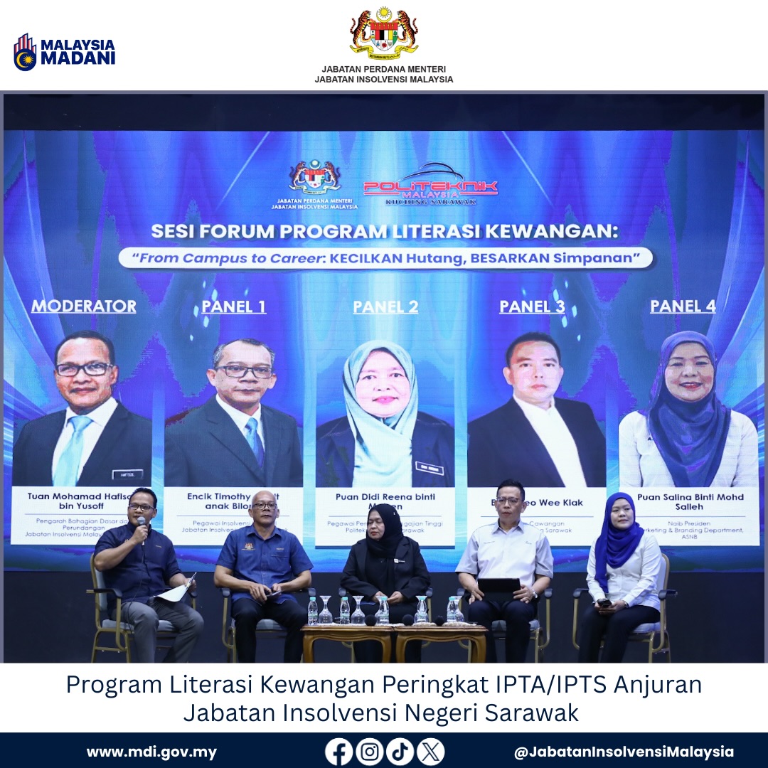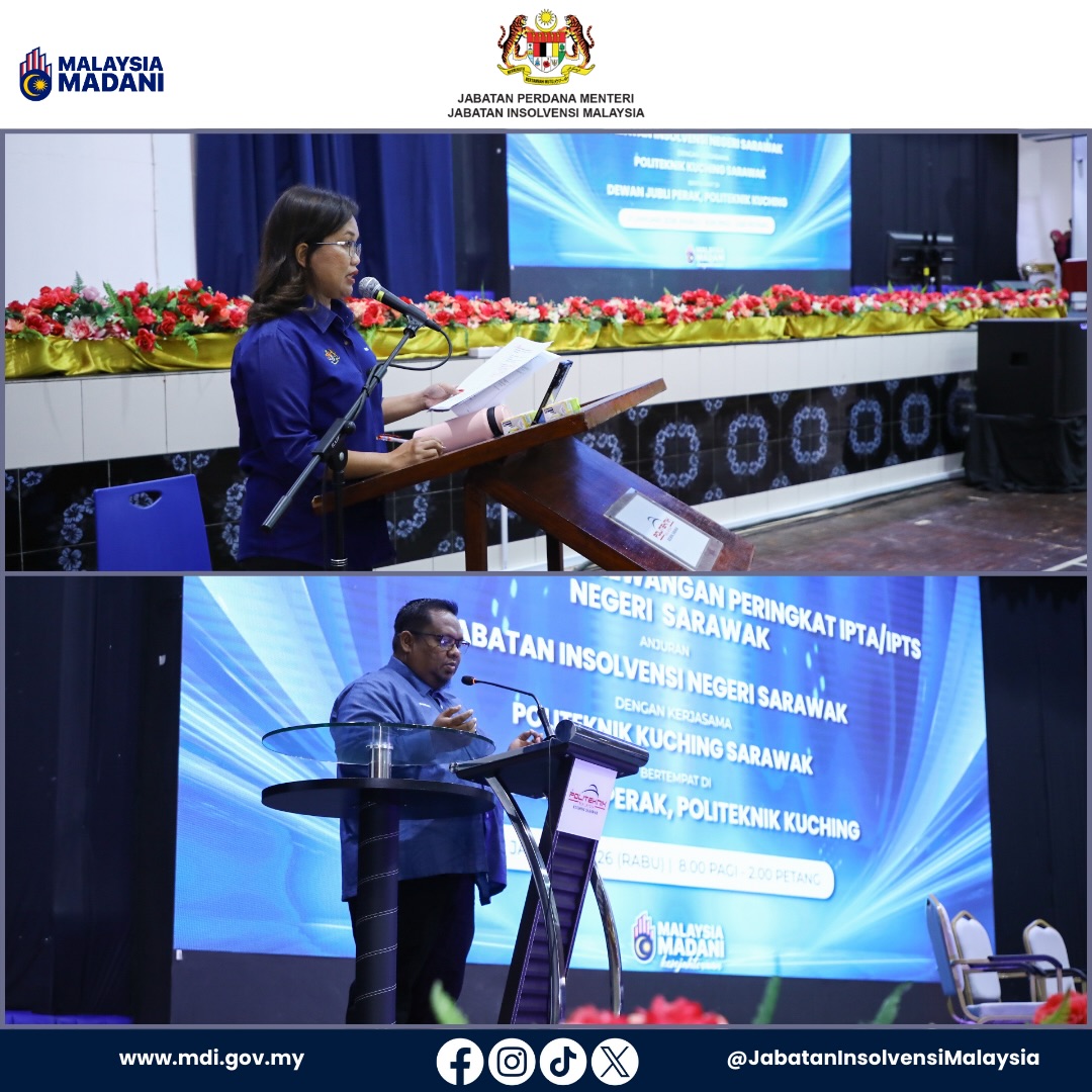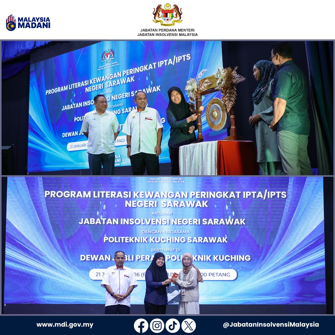 Program Perdana Literasi Kewangan Peringkat IPTA/IPTS anjuran Jabatan Insolvensi Malaysia (MdI) Zon Sarawak telah berjaya dilaksanakan pada 21 Januari 2026 bertempat di Dewan Jubli Perak, Politeknik Kuching Sarawak.