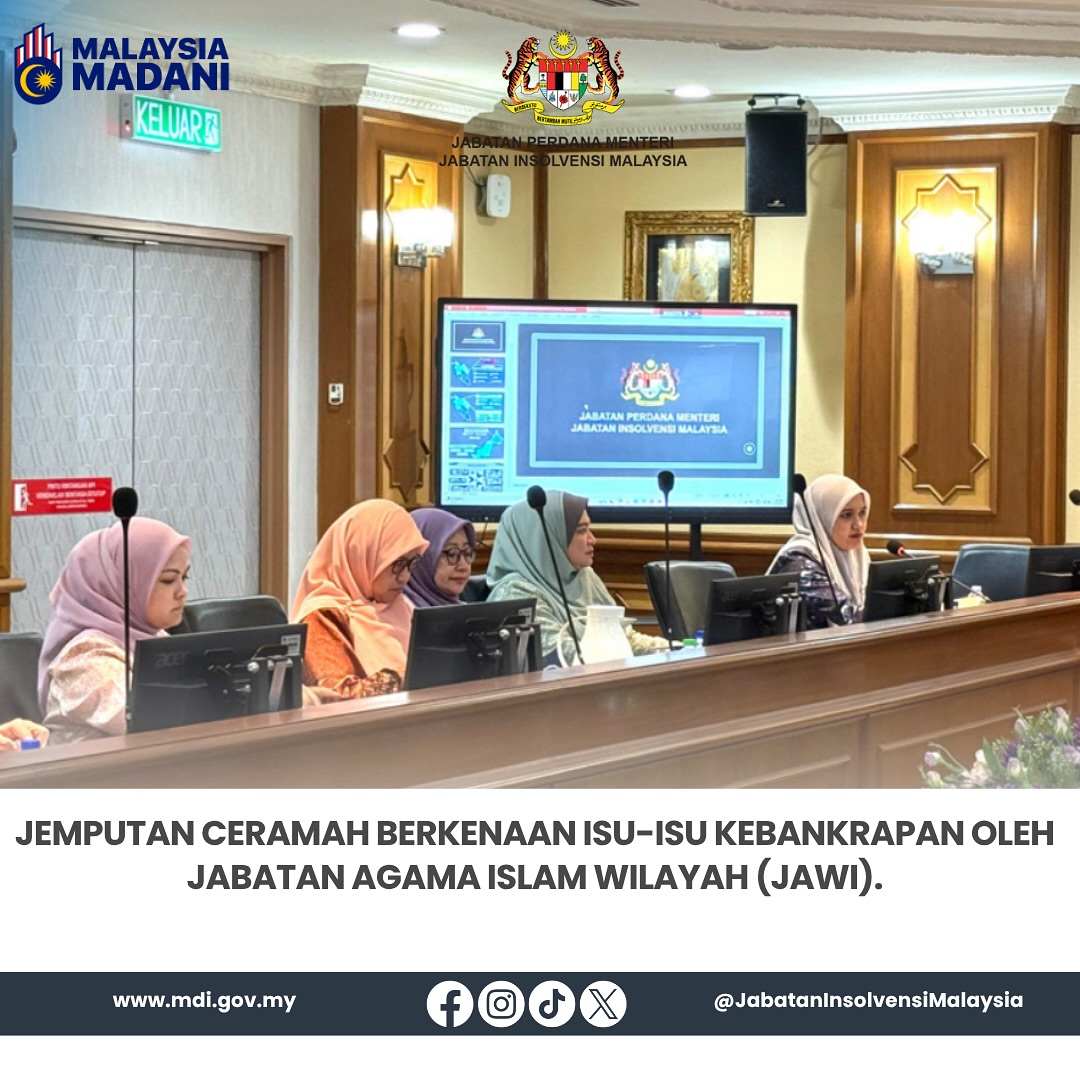 Jabatan Insolvensi Malaysia (MdI) Wilayah Persekutuan Kuala Lumpur telah dijemput menyampaikan ceramah bertajuk “Isu-Isu Kebankrapan” dalam Mesyuarat Jawatankuasa Tatakelola Jabatan Agama Islam Wilayah (JAWI) pada 21 Julai 2025.
