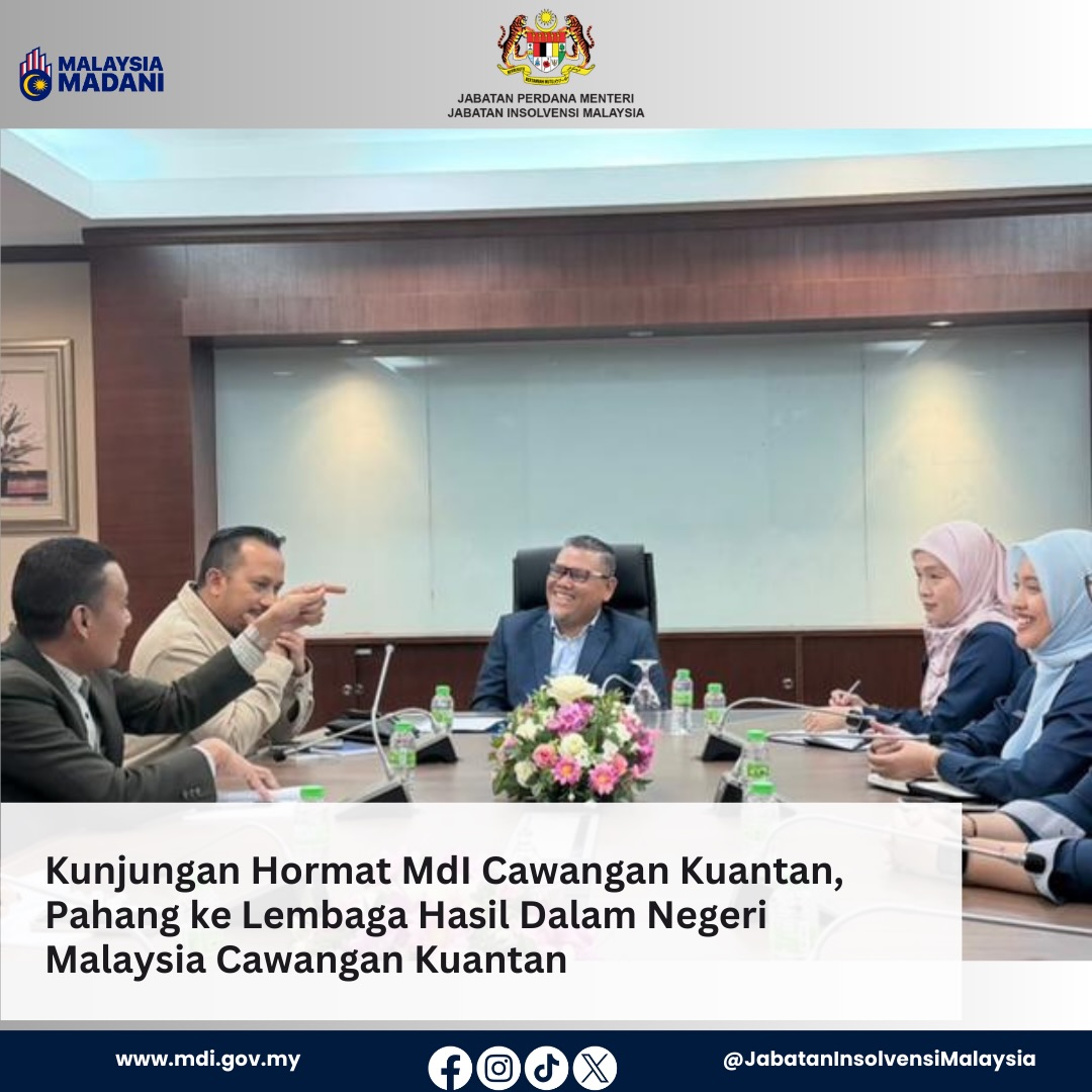 Jabatan Insolvensi Malaysia (MdI) Cawangan Kuantan, Pahag telah mengadakan Sesi Kunjungan Hormat ke Lembaga Hasil Dalam Negeri Malaysia (LHDNM) Cawangan Kuantan sebagai usaha meningkatkan hubungan kerjasama antara agensi.
