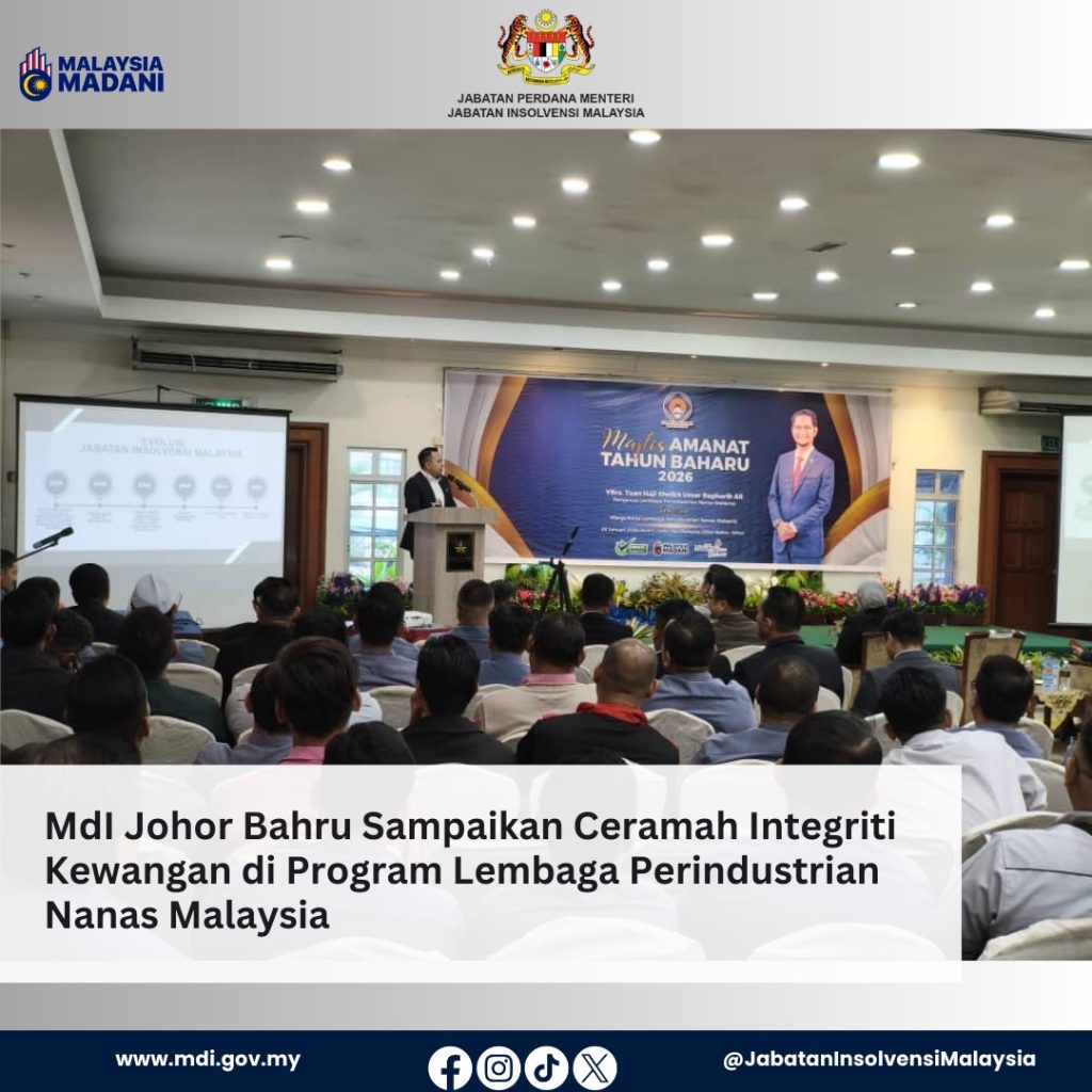 Galeri Foto Photo Gallery MDI JOHOR BAHRU SAMPAIKAN CERAMAH INTEGRITI KEWANGAN DI PROGRAM LEMBAGA PERINDUSTRIAN NANAS MALAYSIA 26 Januari 2026 Jabatan Insolvensi Malaysia (MdI) Johor Bahru telah dijemput sebagai penceramah dalam Program Pengukuhan Integriti anjuran Lembaga Perindustrian Nanas Malaysia (LPNM) yang berlangsung di Hotel Seri Malaysia, Johor Bahru pada 26 Januari 2026.Ceramah bertajuk “Keterhutangan Serius: […]