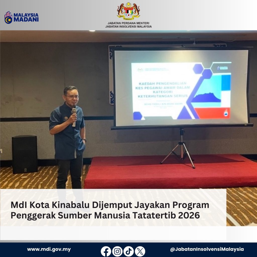 Galeri Foto Photo Gallery MDI KOTA KINABALU DIJEMPUT JAYAKAN PROGRAM PENGGERAK SUMBER MANUSIA TATATERTIB 2026 10 Februari 2026 Jabatan Insolvensi Malaysia (MdI) Cawangan Kota Kinabalu, Sabah telah dijemput untuk menyampaikan ceramah serta membuka reruai sempena Program Penggerak Sumber Manusia Tatatertib Bil. 1 Tahun 2026 anjuran Unit Laporan Ketua Audit Negara & Operasi Khas, Bahagian Perkhidmatan, […]