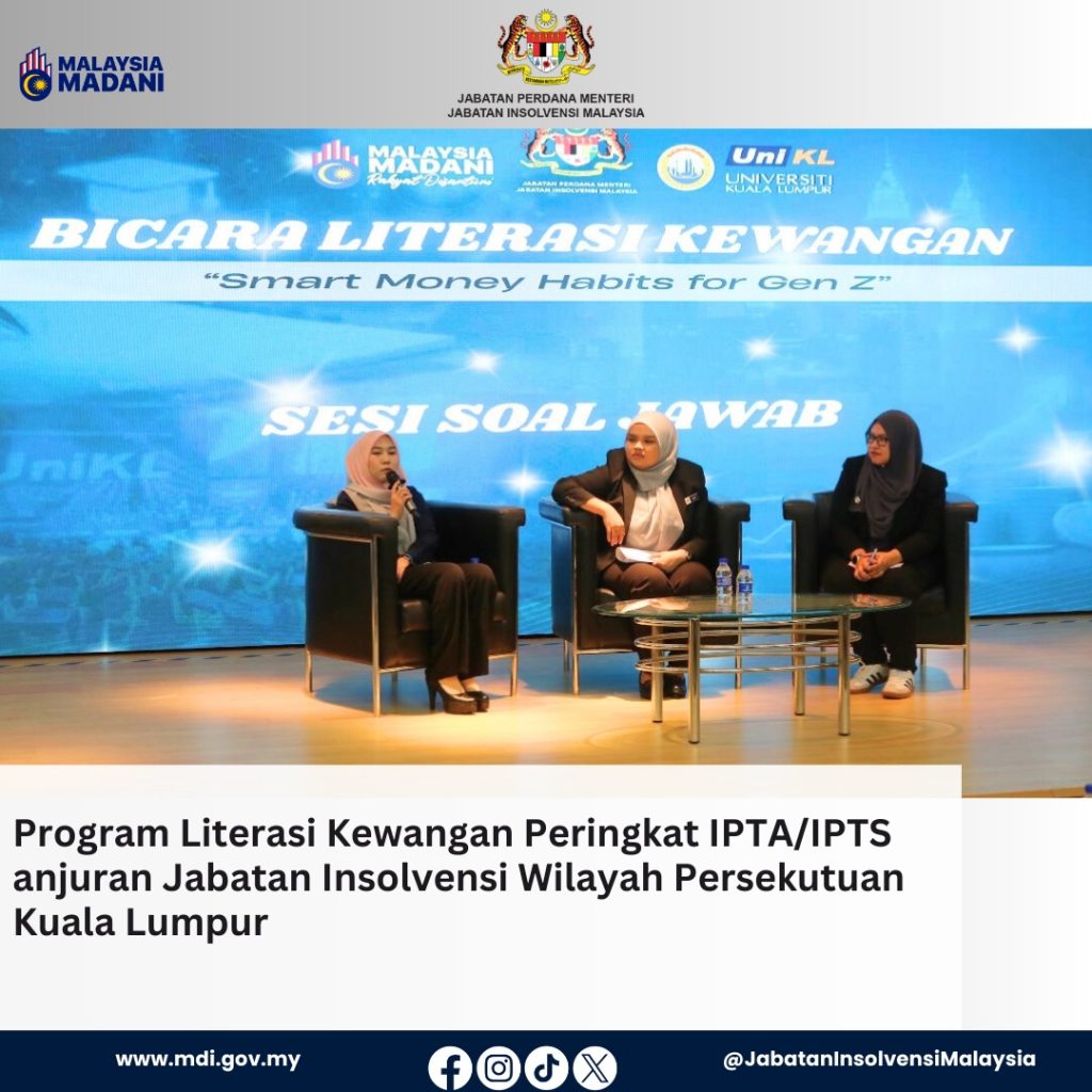 Galeri Foto Photo Gallery PROGRAM LITERASI KEWANGAN PERINGKAT IPTA/IPTS ANJURAN JABATAN INSOLVENSI MALAYSIA (MDI) WILAYAH PERSEKUTUAN KUALA LUMPUR 15 Januari 2026 Sorotan Program Bicara Literasi Kewangan MdI Kuala Lumpur 2025 anjuran Jabatan Insolvensi Malaysia (MdI) Kuala Lumpur bertempat di Universiti Kuala Lumpur (UNiKL) pada 15 Januari 2025.Program Literasi Kewangan yang melibatkan pelajar IPTA/IPTS ini telah […]