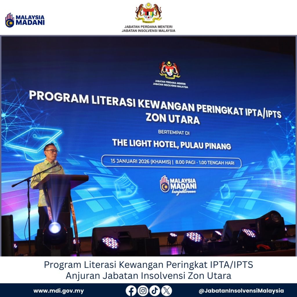 Galeri Foto Photo Gallery PROGRAM LITERASI KEWANGAN PERINGKAT IPTA/IPTS ANJURAN JABATAN INSOLVENSI MALAYSIA (MDI) ZON UTARA 15 Januari 2026 Jabatan Insolvensi Malaysia (MdI) Zon Utara telah menganjurkan Program Literasi Kewangan Peringkat IPTA/IPTS bertempat di The Light Hotel, Pulau Pinang pada 15 Januari 2026 (Khamis).Program ini telah dirasmikan oleh YBhg. Dato’ Ishak bin Bakri, Ketua Pengarah […]