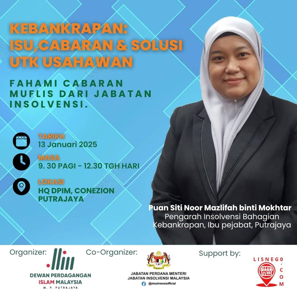 Galeri Foto Photo Gallery TAKLIMAT KEBANKRAPAN : ISU, CABARAN DAN SOLUSI UNTUK USAHAWAN 13 Januari 2025 ? Lokasi: HQ Dewan Perdagangan Islam Malaysia, Conezion, Putrajaya Penceramah: Puan Siti Noor Mazlifah binti Mokhtar (Pengarah Insolvensi, Bahagian Kebankrapan, Ibu Pejabat)Pengisian Majlis:Taklimat ini bertujuan untuk memberi pencerahan kepada para usahawan tentang isu kebankrapan, punca-puncanya, cabaran yang dihadapi, serta […]