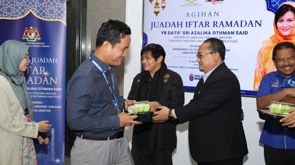 Galeri Foto Photo Gallery MAJLIS AGIHAN JUADAH IFTAR RAMADAN OLEH YB MENTERI DI JABATAN PERDANA MENTERI (UNDANG-UNDANG DAN REFORMASI INSTITUSI) BERSAMA WARGA BANGUNAN HAL EHWAL UNDANG-UNDANG. 19 Mac 2025 YB Dato’ Sri Azalina Othman Said, Menteri di Jabatan Perdana Menteri (Undang-Undang dan Reformasi Institusi) pada hari ini telah meraikan dan menyantuni seluruh warga kerja Bangunan […]