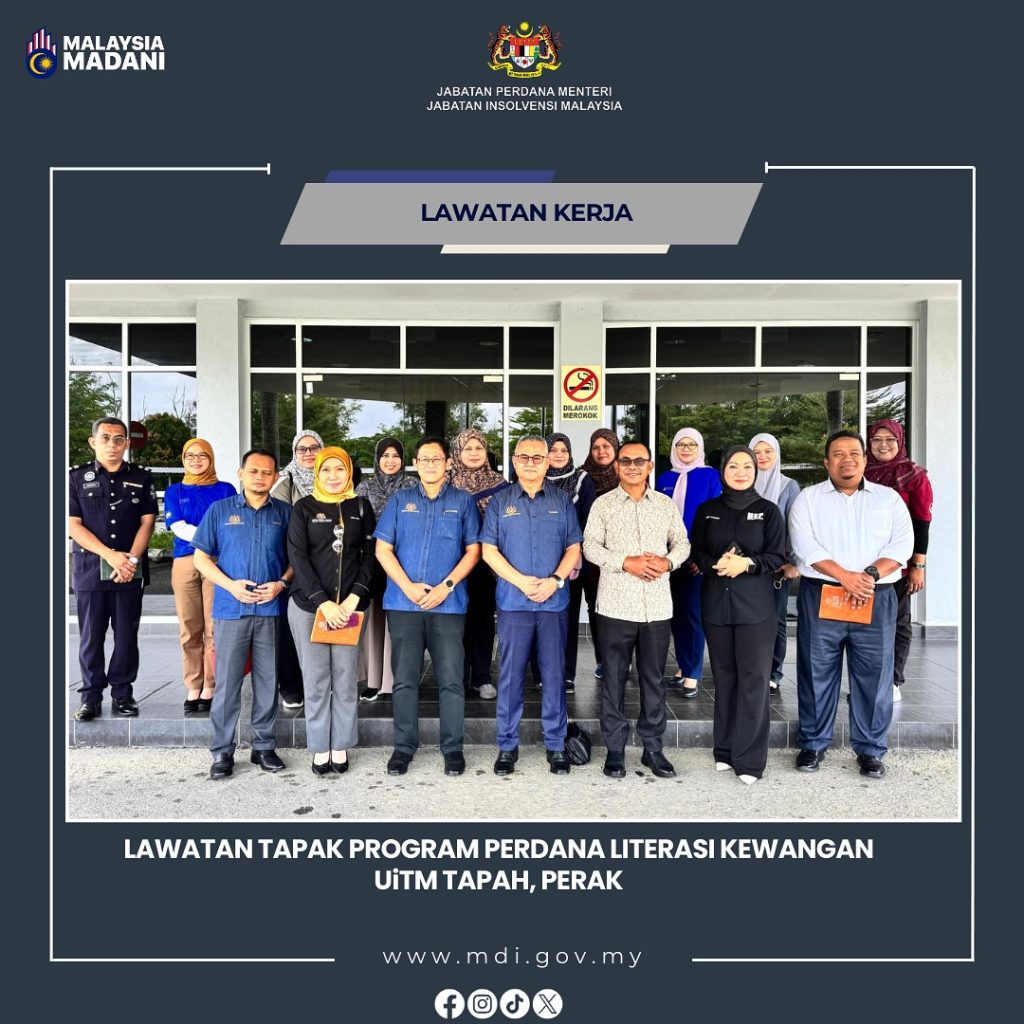 Galeri Foto Photo Gallery LAWATAN TAPAK UNTUK PROGRAM PERDANA LITERASI KEWANGAN 25 Mac 2025 Jabatan Insolvensi Malaysia (MdI) telah mengadakan satu sesi lawatan tapak bagi persiapan Program Perdana Literasi Kewangan IPTA/IPTS yang bakal dilaksanakan dalam masa terdekat. Lawatan ini diketuai oleh YBhg. Datuk M. Bakri Abd Majid, Ketua Pengarah Insolvensi Malaysia bersama Pn. Siti Salwana […]