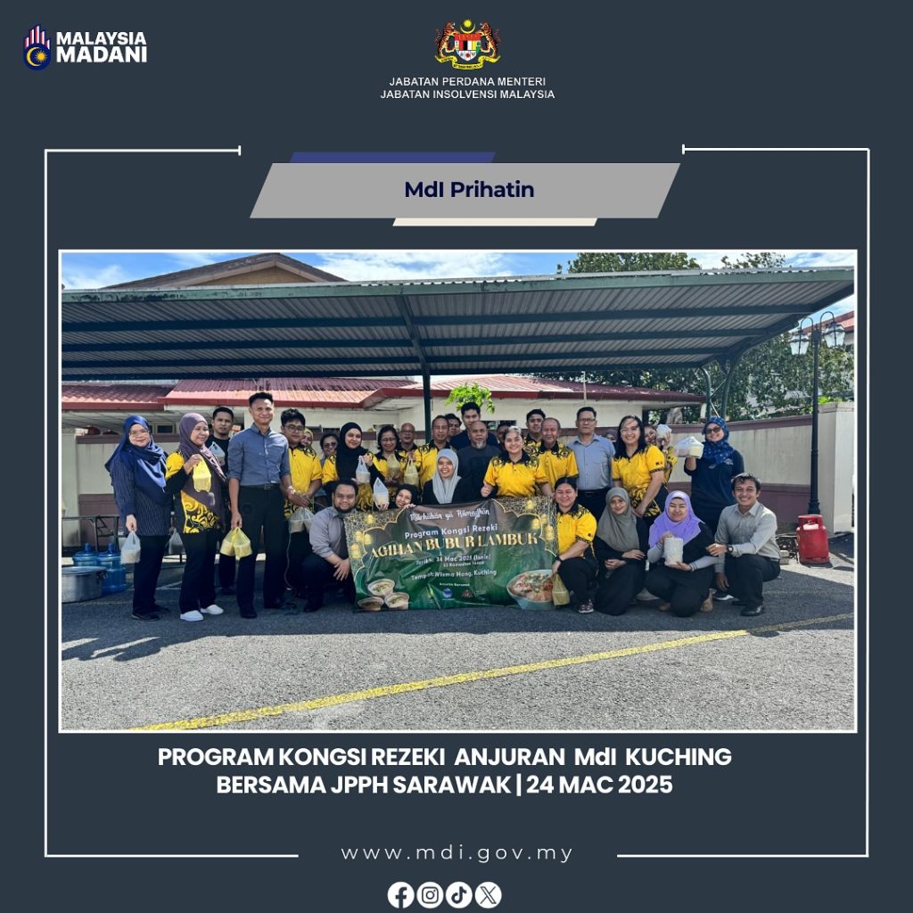 Galeri Foto Photo Gallery AGIHAN BUBUR LAMBUK DI SARAWAK 24 Mac 2025 Sempena keberkatan bulan Ramadan, Jabatan Insolvensi Malaysia (MdI) Cawangan Kuching, Sarawak bersama Jabatan Penilaian dan Perkhidmatan Harta (JPPH) Sarawak telah menganjurkan 𝐏𝐫𝐨𝐠𝐫𝐚𝐦 𝐊𝐨𝐧𝐠𝐬𝐢 𝐑𝐞𝐳𝐞𝐤𝐢 – 𝐀𝐠𝐢𝐡𝐚𝐧 𝐁𝐮𝐛𝐮𝐫 𝐋𝐚𝐦𝐛𝐮𝐤 bertempat di kawasan letak kereta Wisma Hong, Kuching pada 24 Mac 2025. Program ini bukan […]